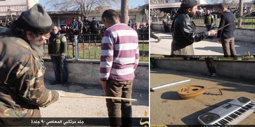 Justice Globe - Suriah, Kelompok militan Negara Islam Irak dan Suriah (ISIS) membuat rekaman video mereka tengah mencambuk sejumlah musisi masing-masing 90 kali dan menghancurkan peralatan musik mereka sebagai hukuman karena memainkan lagu yang dianggap tidak islami.